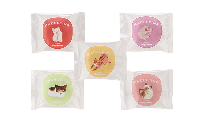 マドレーヌのフィルムデザインは5種類。ランダムに詰め合わせているので、どの小ねこに出会えるかは開けてみてのお楽しみ♪