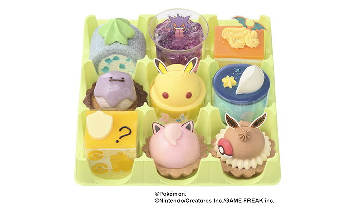ピカチュウは10まんボルトのようにパチパチ弾けるキャンディー入りバナナケーキに、イーブイはキャラメルチョコホイップクリームで毛並みを表現したタルトに、ゲンガーはあやしいオーラをももとブドウ風味のゼリーでデザイン。